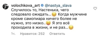На комментарий о том, что в жизни балерины будет еще все хорошо, Волочкова ответила: "Случилось то, чего следовало ожидать. Когда мужчине, кроме самопиара, ничего более не нужно, это низко. Я это все проходила в жизни, и не раз…"