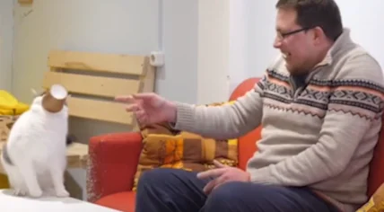 Интервью на этом моменте прервалось, поскольку хозяин засмеялся, показывая пальцем на кота.