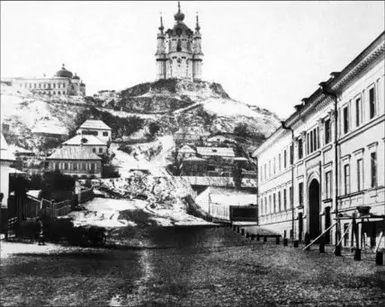 Как видно по фотографии, на то время на Андреевском спуске было еще совсем немного построек. Также можно рассмотреть, как выглядел Подол в середине ХІХ века.