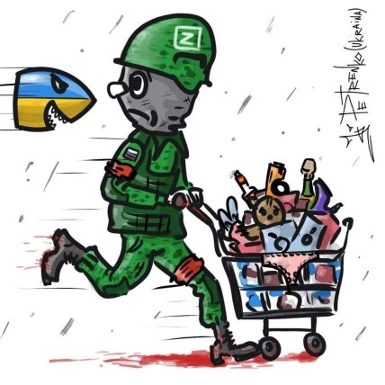 Известный украинский художник Андрей Петренко также посвятил свою новую работу оккупанту-мародеру. Карикатура опубликована на странице художника в Instagram. В своей работе Петренко изобразил убегающего русского солдата с тележкой награбленного от украинской рыбки. На картинке видно, что рашист украл алкоголь, сапоги, трусы и другие товары.