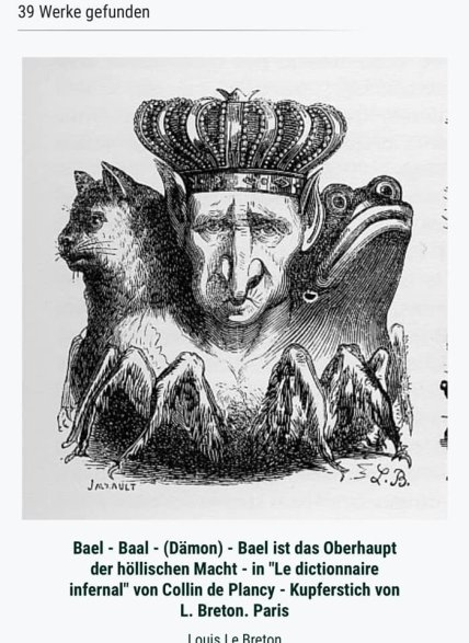 Похожие черты лица также просматриваются в облике демона Баала из книги по демонологии "Инфернальный словарь", написанной в XIX веке.