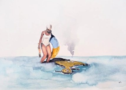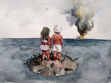 На вопрос, почему именно дети стоят на мине, художник ответил: "Сейчас все дети Украины на мине. Корабль ее оставил, думая, что они погибнут, но что-то пошло не так. Это мое видение, я вообще сейчас редко задумываюсь о смыслах, транслирую только то, что приходит с неба".