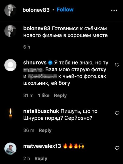 Однако интересно здесь другое. Под снимком появился комментарий из аккаунта Сергея Шнурова, в котором утверждалось, что снимок отфотошоплен, и музыкант сейчас не находится на Донбассе. Отметим, что сейчас комментария под снимком уже нет, однако в сети сохранился скриншот.