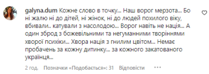 "Уничтожить. Каждого, кто причастен к этой войне. рос солдат, коллаборантов, чиновников, артистов, блогеров. Всех, кто это поддерживает. Сейчас. Через год. Через десять лет. Через пятьдесят. Никогда не простим. Ни дети, ни внуки. И Культурный Десант лично будет следить за тем, чтобы ничего не стерлось и все помнилось через годы. Уничтожить", — написал Серга.