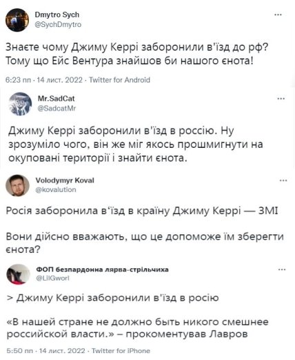 Другие же вспомнили о том, что актер сыграл роль детектива Эйса Вентуры, который занимался поиском пропавших домашних животных, и предположили, что россия таким образом запретила ему въезд, чтобы тот не поехал возвращать похищенного в Херсоне енота.