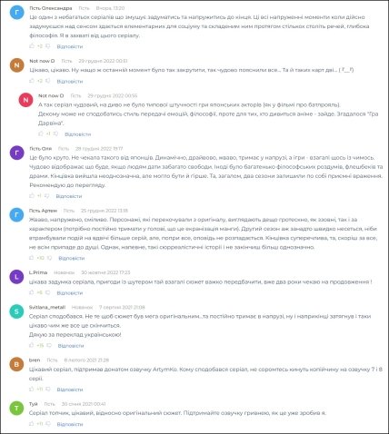 "Один из немногих сериалов, что заставляют задуматься и напрячься до конца. Я в восторге", "Не ожидала такого от японцев. Динамично, драйвово, держит в напряжении. Отлично отображает, что будет с людьми, если им дать слишком много свободы", "Концовка спорная и, наверное, не всем придется по душе. Но такие сюрреалистические истории и не закончишь более однозначно", "Отличная задумка", — среди прочего, пишут в комментариях.