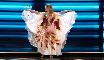 Во время позирования в купальнике россиянка, подбрасывая накидку с изображения жар-птицы, показала средний палец, а затем с ухмылкой покинула сцену. Момент попал на видео.