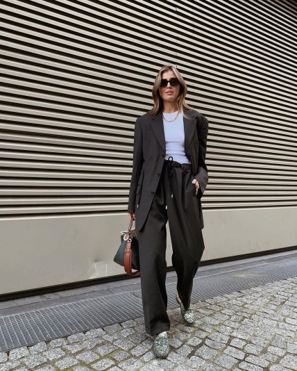 Главное правило: весь объем должен быть сосредоточен в одной зоне. Если вы выбираете оверсайз-жакет, то желательно остановиться на прямых или даже немного зауженных брюках или джинсах. Это поможет компенсировать объем в талии и плечах, а еще визуально вытянет ноги, а весь силуэт сделает легче. Для усиления эффекта подбирайте обувь на каблуке или массивной подошве.