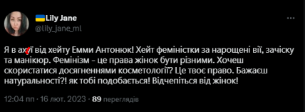 В социальных сетях негативно отозвались о неоднозначных словах ведущей. Пользовательницы подчеркивают, что феминизм — это право каждой женщины делать со своей внешностью то, что ей хочется. Также слова самой Антонюк обратили против нее самой, ведь по ее словам, она борется за феминизм, однако сама пришла на интервью с макияжем и теми самими нарощенными ресницами.