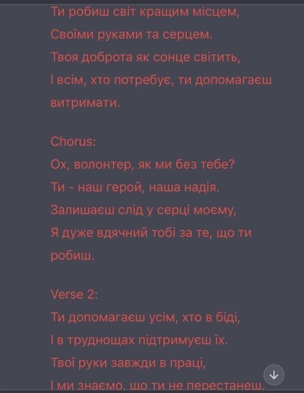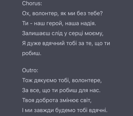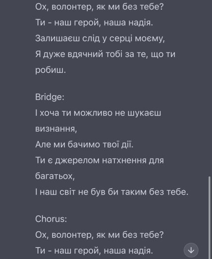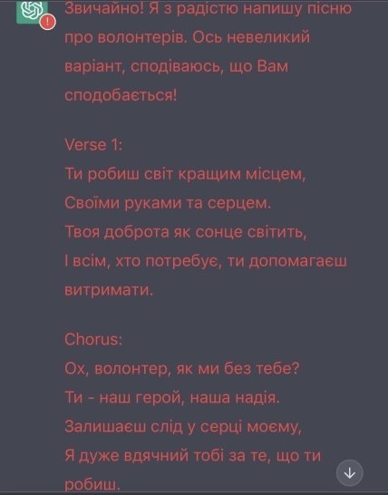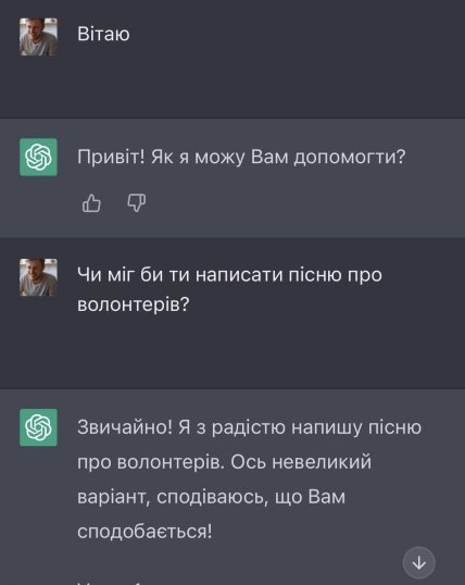 Сегодня же стало известно, что в Украине теперь доступен чат-бот GPT. Многие пользователи сразу ринулись попробовать все его преимущества, а некоторые решили совместить "приятное с полезным". Журналист Bogdan Logvynenko, например, попросил ИИ написать песню о волонтерах. И вот, что из этого вышло: