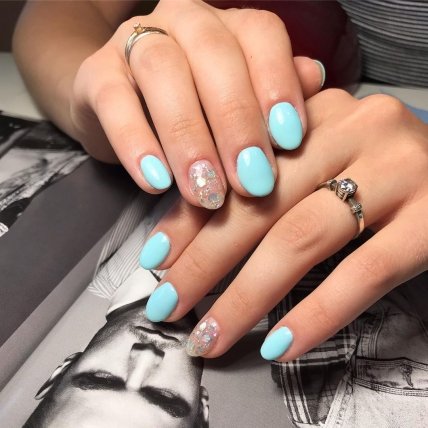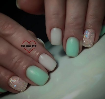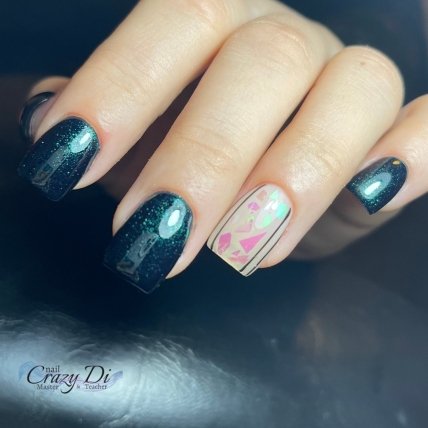 Таким образом можно украсить как каждый пальчик, так и какой-то один-два, если вам не хочется привлекать лишнего внимания. Эффект битого стекла будет выглядеть как настоящий витраж — очень круто и оригинально.