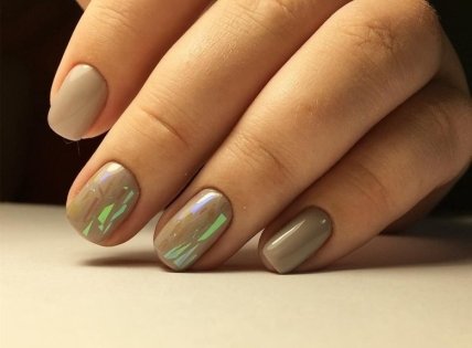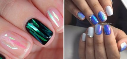 Имитация эффекта битого стекла прекрасно смотрится и на длинных, и на коротких ногтях. Создать его помогает голографический целлофан, крепящийся на ногтевую пластину и при попадании на него света дает непревзойденный результат.