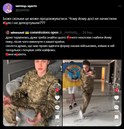Также украинские блогеры пишут, что за такие действия тиктокера нужно проучить за то, что тот надевает военную форму, снимает "в ней танцульки и чувствует себя кайфово".