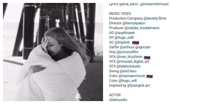 "Новый клип Тины Кароль "Honey/Мед" оказался с тюменским душком… Вероятно, эта Beverly.films выдала список людей, работавших над клипом и которых нужно отметить, а команда Кароль не проверила, кто в перчатке живет. А живет там вовчик-братец, и не один", — написали в посту. Кстати, список привлеченных россиян Кароль быстро поправила.
