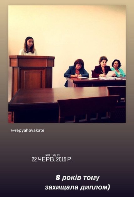 В сторис Инстаграма девушка запостила фотографию, на которой она стоит за кафедрой в аудитории перед преподавателями. "8 лет назад защищала диплом", — подписала фото Екатерина (2015 год).