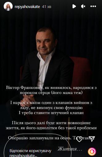По словам 29-летней девушки, Народный артист Украины родился с пороком сердца. Этим Екатерина поделилась с поклонниками в сторис Инстаграма.