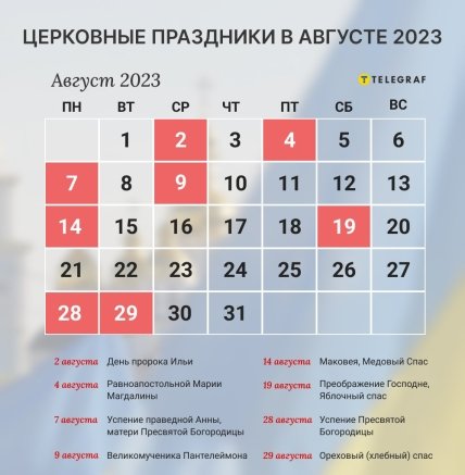 "Телеграф" рассказывает, какие еще православные праздники будут отмечаться в течение последнего месяца лета. Вашему вниманию представлен календарь с основными датами.