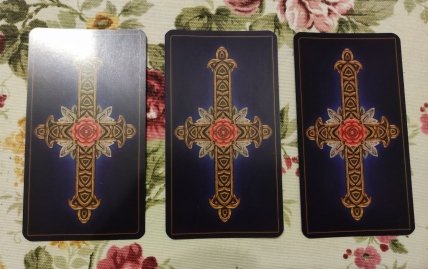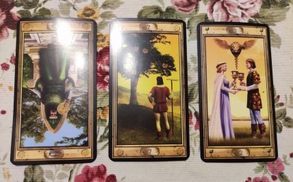 Слева направо — перевернутый Король пентаклей, Семерка пентаклей, Двойка кубков
