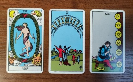 Слева направо — Мир, Десятка кубков, Восьмерка пентаклей