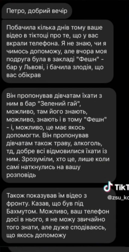 Однако Петру удалось найти одного из вероятных обидчиков – Романа Лучкива. Полиция возбудила против него уголовное производство, однако сам грабитель находится до сих пор на свободе. Военный записал видео в TikTok с просьбой помочь в совершении справедливости. Как оказалось, люди начали следить за мужчиной, подозреваемым в краже. Он оказывается причастен ко многим другим преступлениям, говорится в новом видео Петра.
