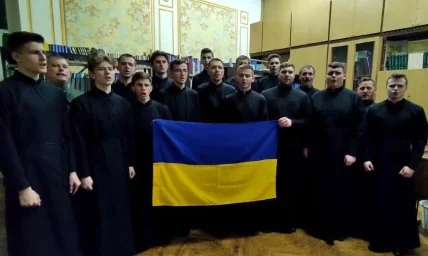 Ученики Ровенской духовной семинарии Православной церкви Украины исполнили повстанческую песню с флагом в руках.