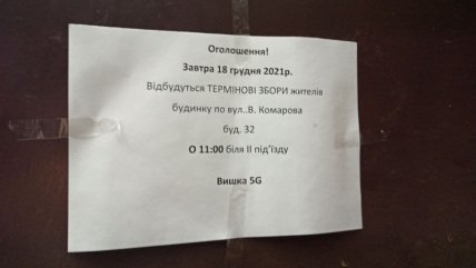 Как сообщает издание "Молодой Буковинец", новую конструкцию странной формы заметили жители домов на пересечении улиц Комарова и Героев Майдана. Сооружения очень ужаснули людей и даже заставили провести собрание. Судя по объявлениям на домах, темой обсуждений должны были стать "вышки 5G".