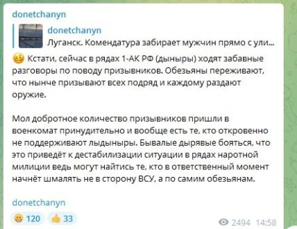 Блогер также подчеркнул, что подобная ситуация наблюдается и на неподконтрольных территориях Донецкой области, где в рядах боевиков ходят разговоры о том, что многих "призывников" согнали в принудительном порядке, а среди них есть и те, кто открыто не поддерживает т.н "ЛДНР".