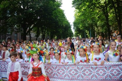 На фотографиях — очень много детей в национальной одежде. Как в 2019 году отмечал мэр города Вадим Бойченко, с каждым годом участников шествия становилось все больше.