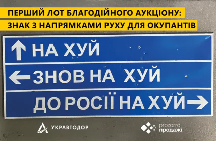 Государственное агентство автомобильных дорог Украины проведет первый благотворительный онлайн-аукцион, лотом которого станет легендарный дорожный указатель "Нах*й, снова нах*й, в россию нах*й".
