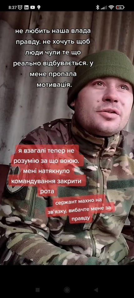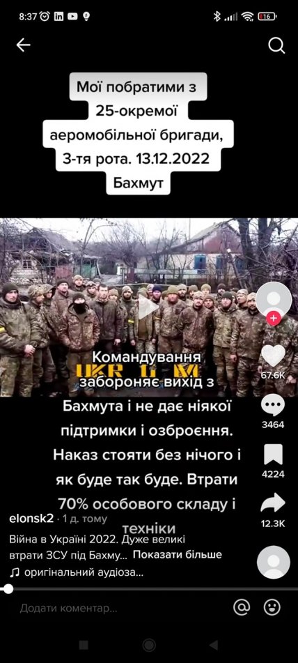 Мужчина на видео рассказывает, что военные ВСУ якобы отступают из Бахмута, непонятно за что воюют, есть дефицит с формой. В то же время реальные пользователи переживают и верят в сказанное.