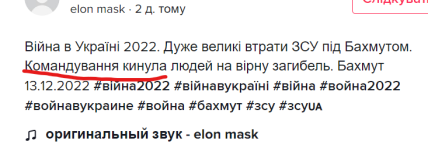 Также на аккаунте выложено 4 видео о Бахмуте: сначала бойцы якобы выезжают из-за потерь, далее следует информация, что из Бахмута уезжать должны завтра, следующее видео — показывают, как их будто не выпускают из Бахмута.