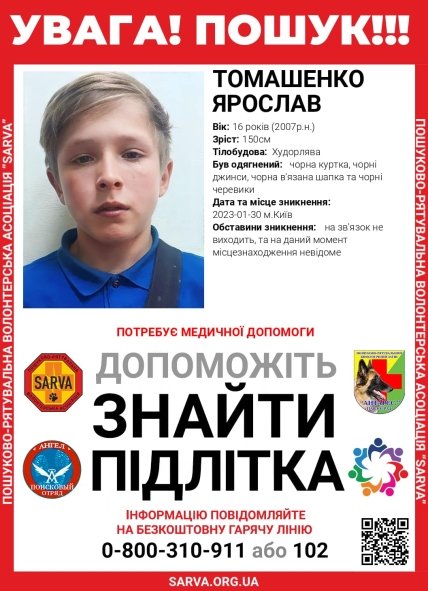 Следователи Днепровского управления Нацполиции в Киеве официально объявили в розыск несовершеннолетнего Томашенко Ярослава Викторовича, который несколькими днями ранее самовольно покинул столичную детскую больницу и до сих пор его местонахождение остается неизвестным.