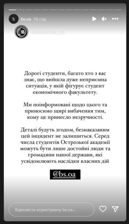 "Дорогие студенты, многие из вас знают, что получилась очень неприятная ситуация, в которой фигурирует студент экономического факультета. Мы проинформированы по этому поводу и приносим искренние извинения тем, кому это доставило неудобства", — говорится в сообщении.