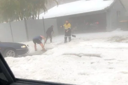 В граде, который как снег укрыл улицы, буксовали машины — жители откапывали их подручными средствами.