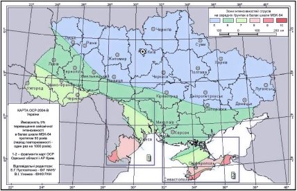 Об этом инженер-конструктор Дмитрий Макогон сообщил в сети, опубликовав карту ОСР-2004 о вероятности сейсмической интенсивности в Украине по шкале MSK-46 (12-балльная шкала интенсивности землетрясений Медведева-Шпонхоера).