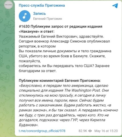 "Безусловно, я передам тело американца, сделаю специально для издания The Washington Post. Они откликнулись на мою просьбу, я сегодня в личку получил все имена, пароли, явки. Сейчас будем работать с заказчиками. Будем работать жестко, "в рамках закона", я бы так сказал. А передавать конечно же буду, с трех раз догадайтесь, через кого. Кто не догадался, подсказка: через ГУР, через Кирилла Буданова", — сказано в сообщении пригожина.