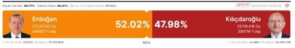 Как сообщает издание Anadolu, согласно подсчету почти 99% всех голосов победу одерживает Эрдоган, который смог заручиться поддержкой 52,08% избирателей.