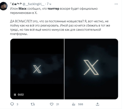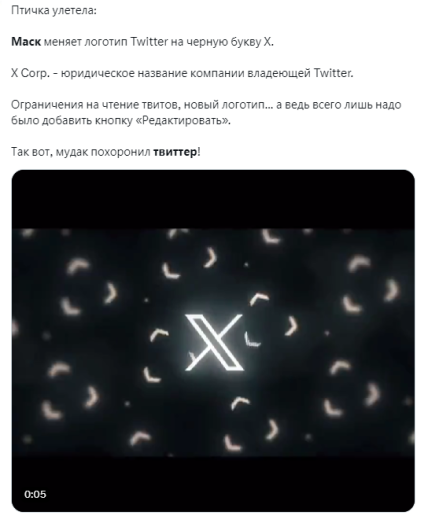 Спустя некоторое время он опубликовал новый логотип Twitter — короткое видео с мигающей буквой X на черном фоне.