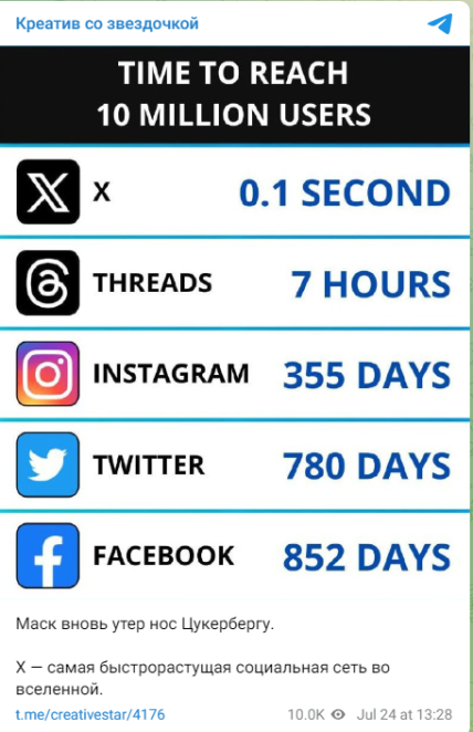 Напомним, ранее "Телеграф" писал о том, что летом 2023 года компания Meta Марка Цукерберга запустила новую социальную сеть Threads, которая стала конкурентом "Твиттеру". За первые несколько часов в ней зарегистрировалось более 2 млн человек. Вскоре на это отреагировал Илон Маск и закатил настоящий скандал, заявив, что подаст в суд на "Мету". Соответствующее письмо уже было отправлено в офис компании.