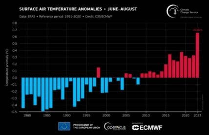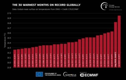 В прошлом месяце была зафиксирована самая высокая глобальная среднемесячная температура поверхности моря за все время наблюдений. Она составила 20,9°C. Рекордной также стала средняя температура в июне-августе – 16,77 °C. Этот показатель на 0,66 ° C выше среднего. Превышает он и предыдущий рекорд, зафиксированный в 2019 году.