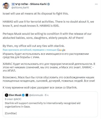 "ХАМАС будет использовать его для террористической деятельности. В этом нет никаких сомнений, мы это знаем, и Маск это знает. ХАМАС — это ИГИЛ", — написал в соцсети X министр связи Израиля Шломо Караи.