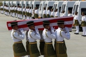 "Сегодня мы скорбим по нашим погибшим. Сегодня мы начинаем возвращать их домой. Наши мысли и наши молитвы с семьями и друзьями тех, кто отдал свою жизнь. Сегодня мы вместе с вами, едины, как один", - сказал премьер -министр Наджиба Разак. Около 30 млн малазийцев почтили минутой молчания жертв катастрофы. Некоторые виды общественного транспорта в столице прекратили движение на время минуты памяти.