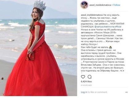 В Киргизии в ночь на 3 июня погибла Сания Шакирова, которая на конкурсе красоты Miss Universe Beauty - 2018 победила в номинации "Missis World".