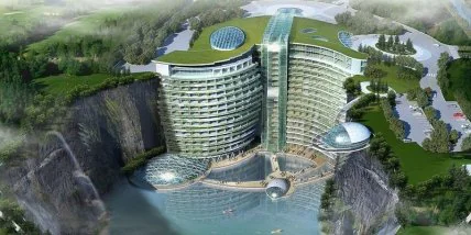 Вблизи Шанхая открыли пятизвездочный гостиничный комплекс, который построили за 12 лет на месте бывшего карьера глубиной 88 метров.