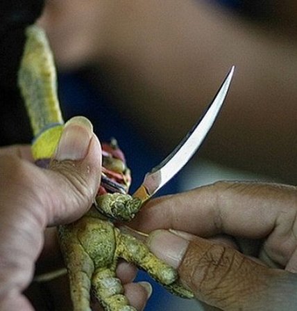 Бойцовым петухам к лапам привязывают острые шпоры, после чего птиц выводят на арену. Пернатые бьются до тех пор, пока один из них не погибнет.