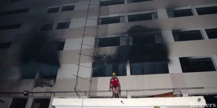 28 апреля на месте обрушившейся фабрики также вспыхнул пожар. Тогда возгорание произошло, когда спасатели пытались добраться до уцелевших в трагедии, разрезая специальными инструментами стальную арматуру.