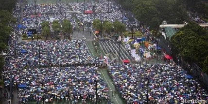 В грандиозном марше в защиту демократических свобод участвуют десятки тысяч человек. Они вышли на улицы, несмотря на дождь и ветер, вызванные приближением тайфуна.