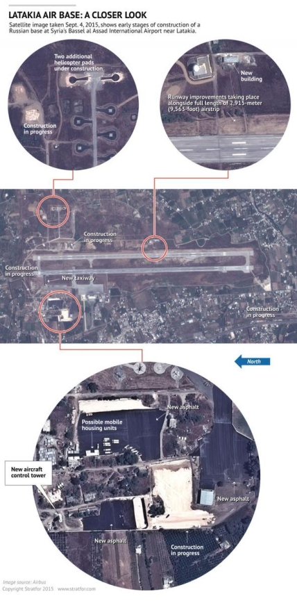 Напомним: по информации американской частной разведывательно-аналитической компании Stratfor, существуют спутниковые снимки, где зафиксирована вся деятельность русских в районе аэропорта Латакии. Она включает, в частности, укрепление взлетно-посадочных полос, строительство вертолетных площадок, установку мобильных жилых домов, возведение новых объектов, включая башни управления воздушным движением.