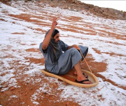 В провинции Табук на севере Саудовской Аравии второй год подряд выпал снег, бедуины катаются с горы на санках.