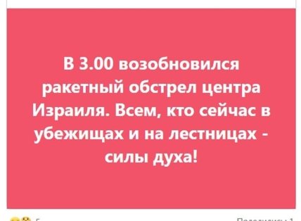 Девушка обращает внимание на настрой местных жителей: "Израильтяне, конечно, удивительный народ – только отгрохотало все и через пару минут начали появляться разные шуточки в соцсетях, типа "сняли маски, надели каски" и т.п. Ну, для нормальных где здесь посмеяться? После какого слова? Это же чертова констатация факта! А нам ржачно! А потом просто прибило... странное, непонятное, тягучее чувство... Может удас...".